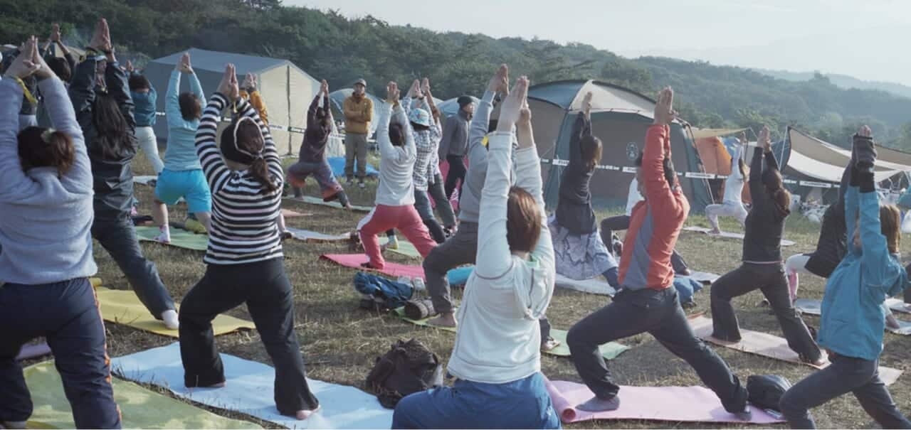 富士山を望む広大な草原でテントを張り、昼は音楽を楽しみ、夜は焚き火を囲んで語り合い、夜空に輝く星を眺めながら過ごす。