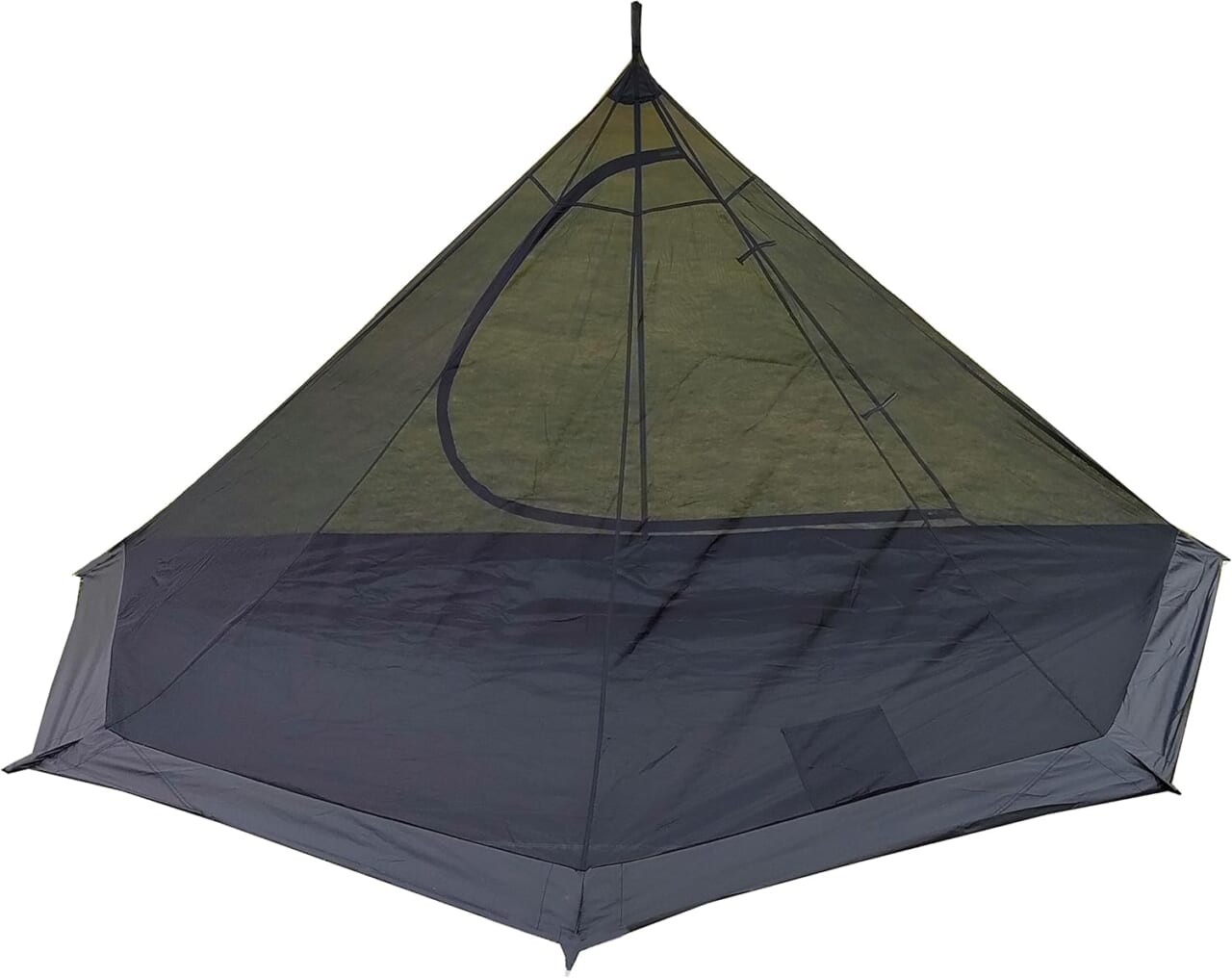 五角形の蚊帳は400cmのピラミッドテントに対応し、枝やトレッキングポールと組み合わせて設置可能です。