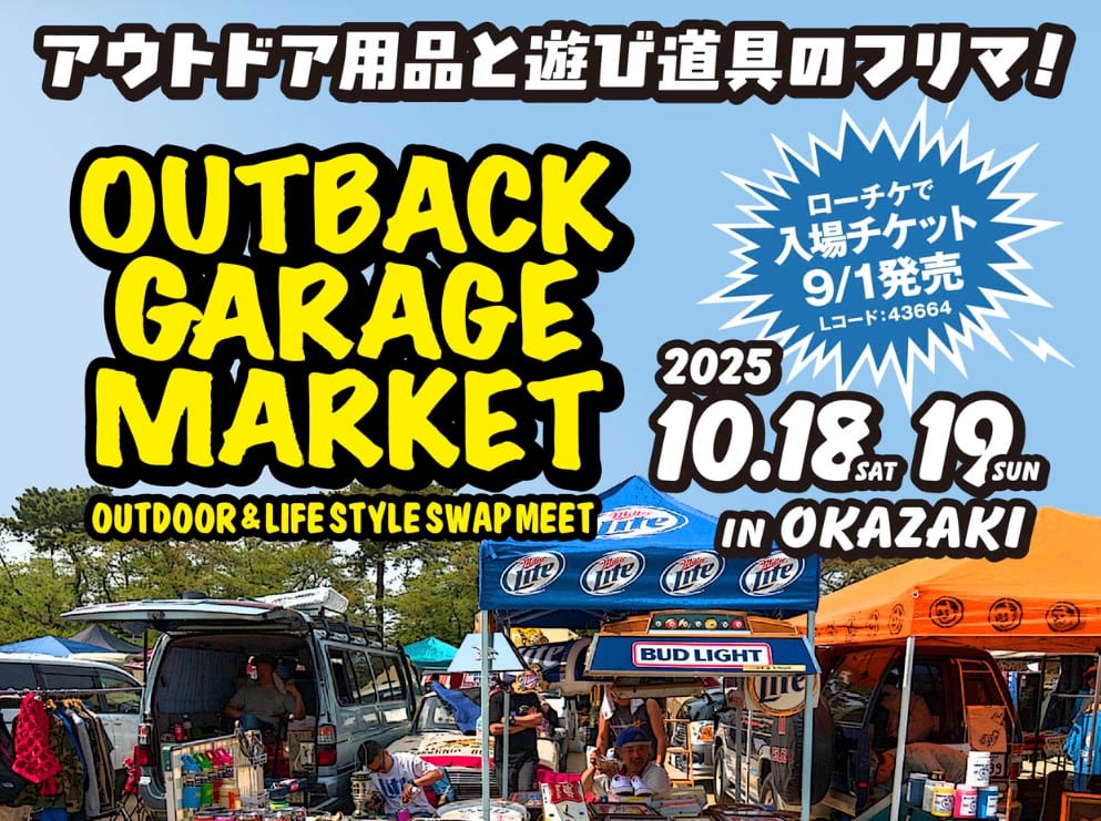 アウトドア系アイテムをメインにしたフリーマーケット「OUTBACK GARAGE MARKET in OKAZAKI vol.7」が、2025年10月18日(土)・19日(日)の2日間、愛知県岡崎市の乙川河川敷(右岸特設会場)で開催されます。