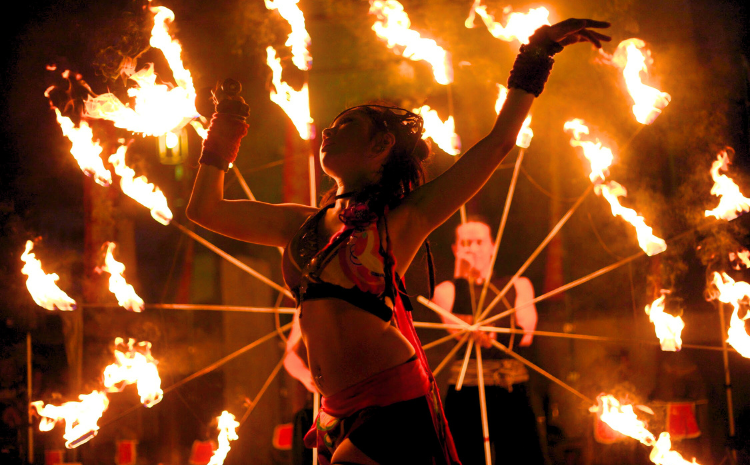 夜にはファイヤーパフォーマンスや打楽器のパレード、民族音楽のライブが会場を盛り上げます。