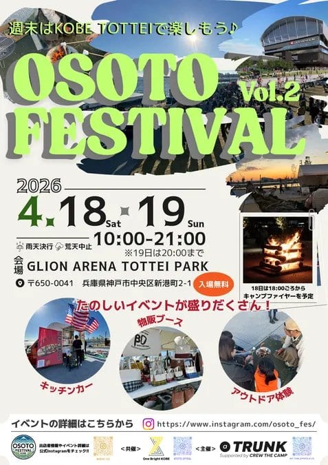 2026年4月、神戸の港に新たなアウトドアの風が吹き込みます。都市の真ん中で自然を身近に感じられる「OSOTO FESTIVAL vol,2」が、GLION ARENAのTOTTEI parkで開催決定しました。