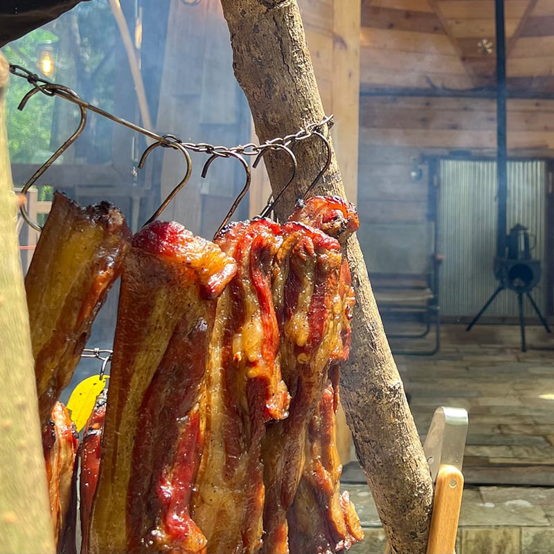 tent-Mark DESIGNSとのコラボギア「WORKERS OKAMOSHI」の生みの親でもある長野さんによる定番の焚火ベーコンに加え、今年はイノシシとシカのジビエベーコンも登場します。
