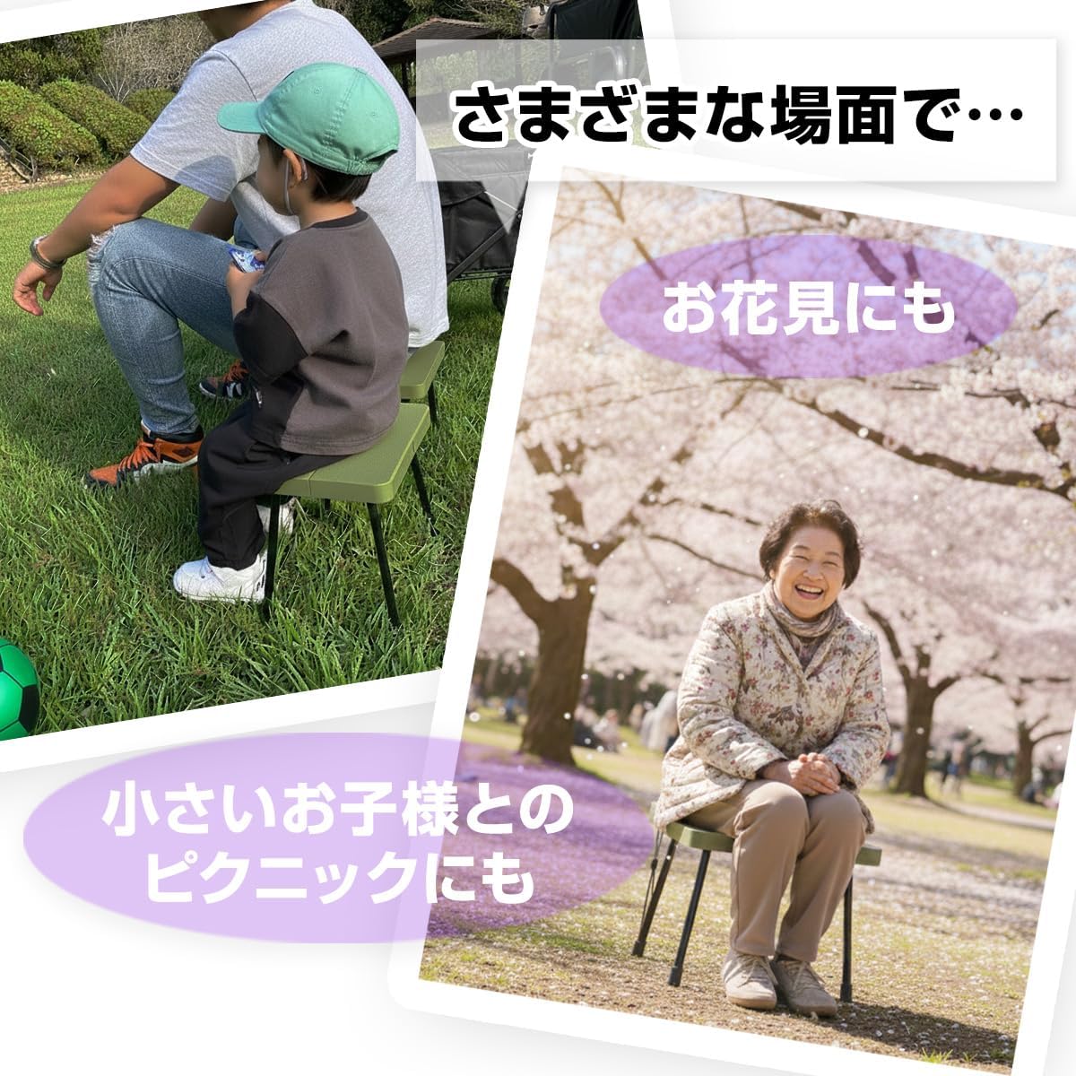 運動会や行列待ち、釣りやキャンプなど、座る場所に困る場面で手軽に使える点が特徴です。