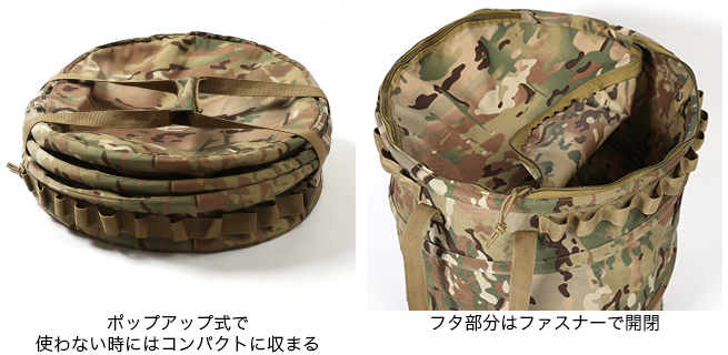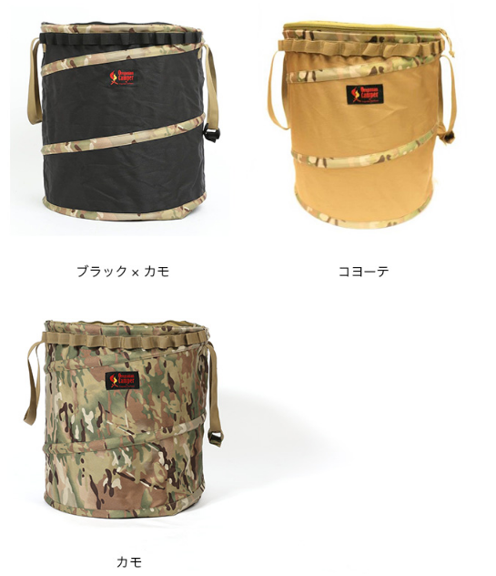 「ポップアップトラッシュボックス」のカラーは、「ブラック(×カモ)」「コヨーテ」「カモ」、そしてこの他にリミテッドカラーの「マルチカモ×コヨーテ」があります。販売サイトによって、取り扱っているカラーが異なりますのでご注意ください。