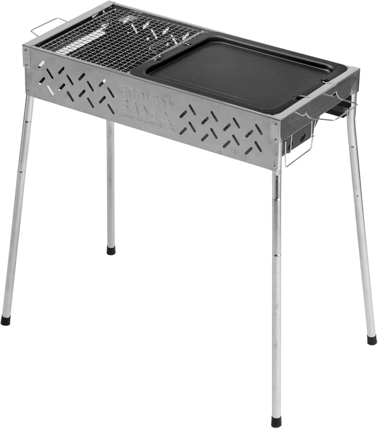 ステンレス製で錆びにくく、炭入れは独立式。収納ケース付きで持ち運びや後片付けも簡単です。