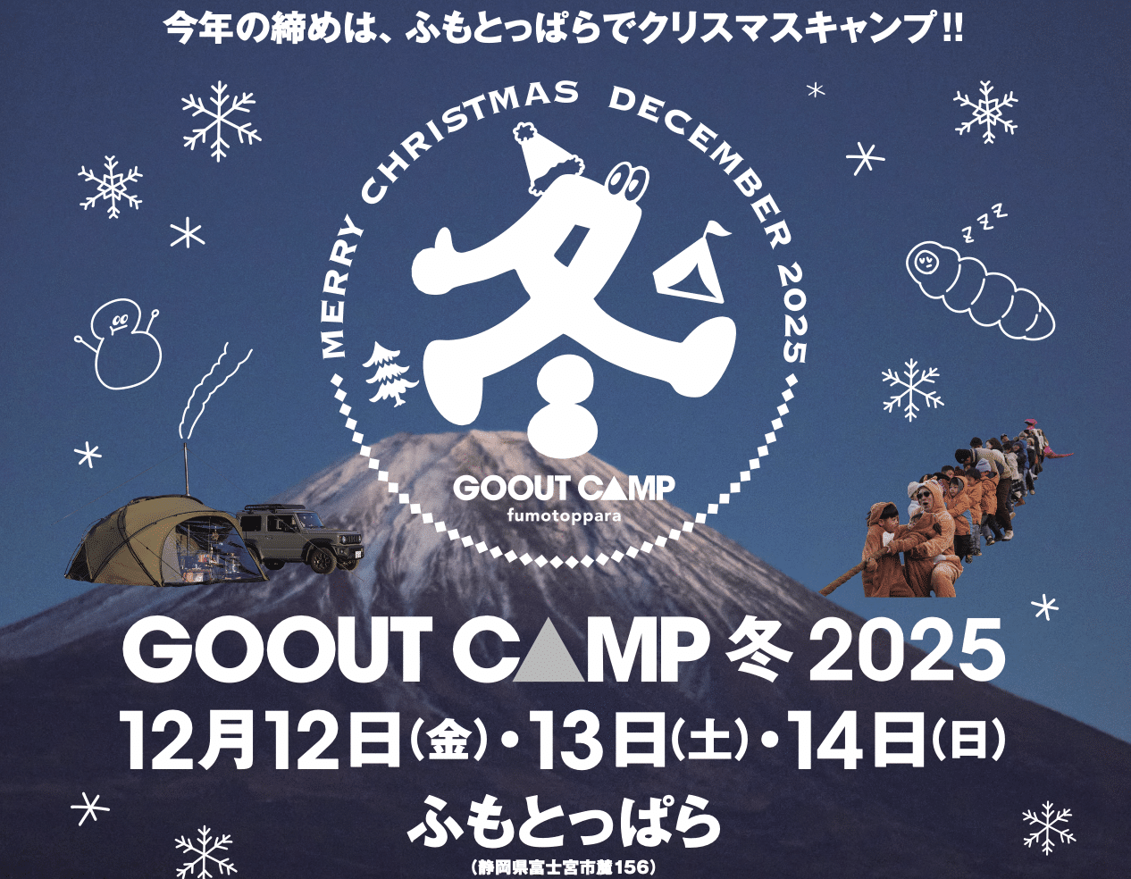 GO OUT CAMP 冬2025は、2025年12月12日から14日までの3日間、静岡県富士宮市のふもとっぱらで開催される冬キャンプフェスです。