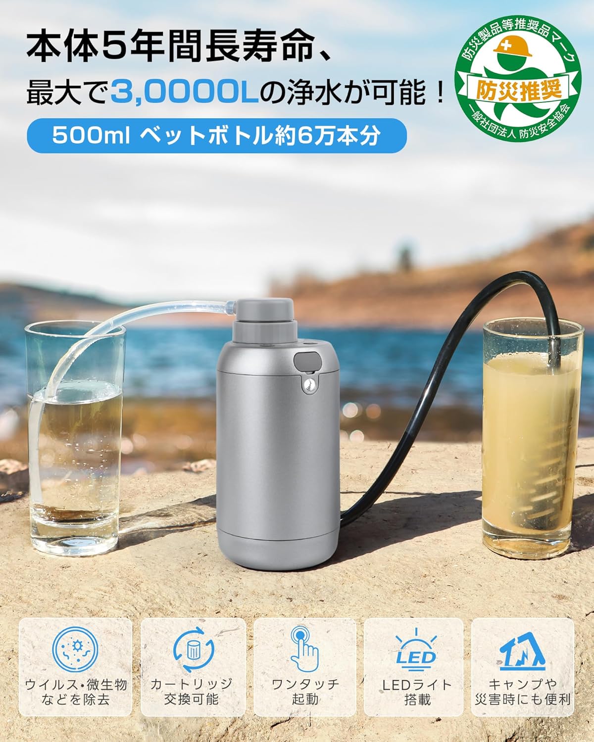 アウトドア時だけでなく、災害時にも活用できる本格的な携帯浄水器です。