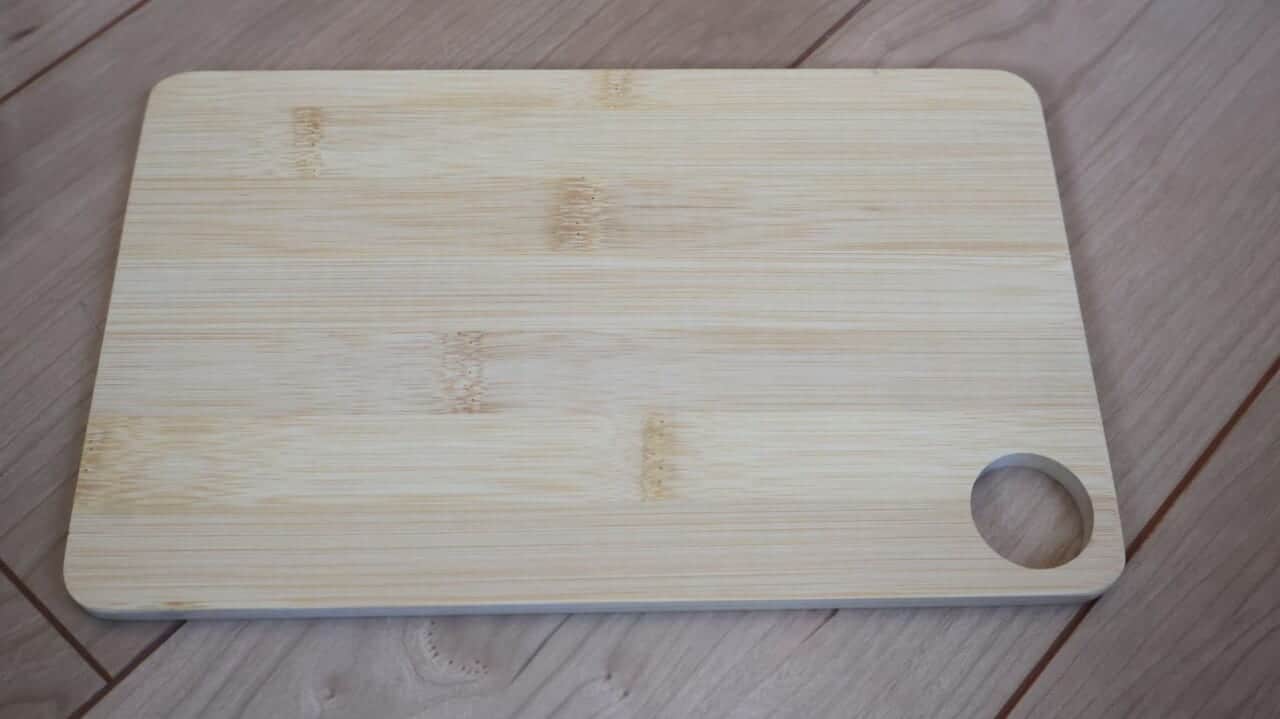 左側にはカップなどを入れるのにぴったりのくぼみ、そして左側下には吊り下げ収納や指を入れてカッティングボードを持つための穴があります。