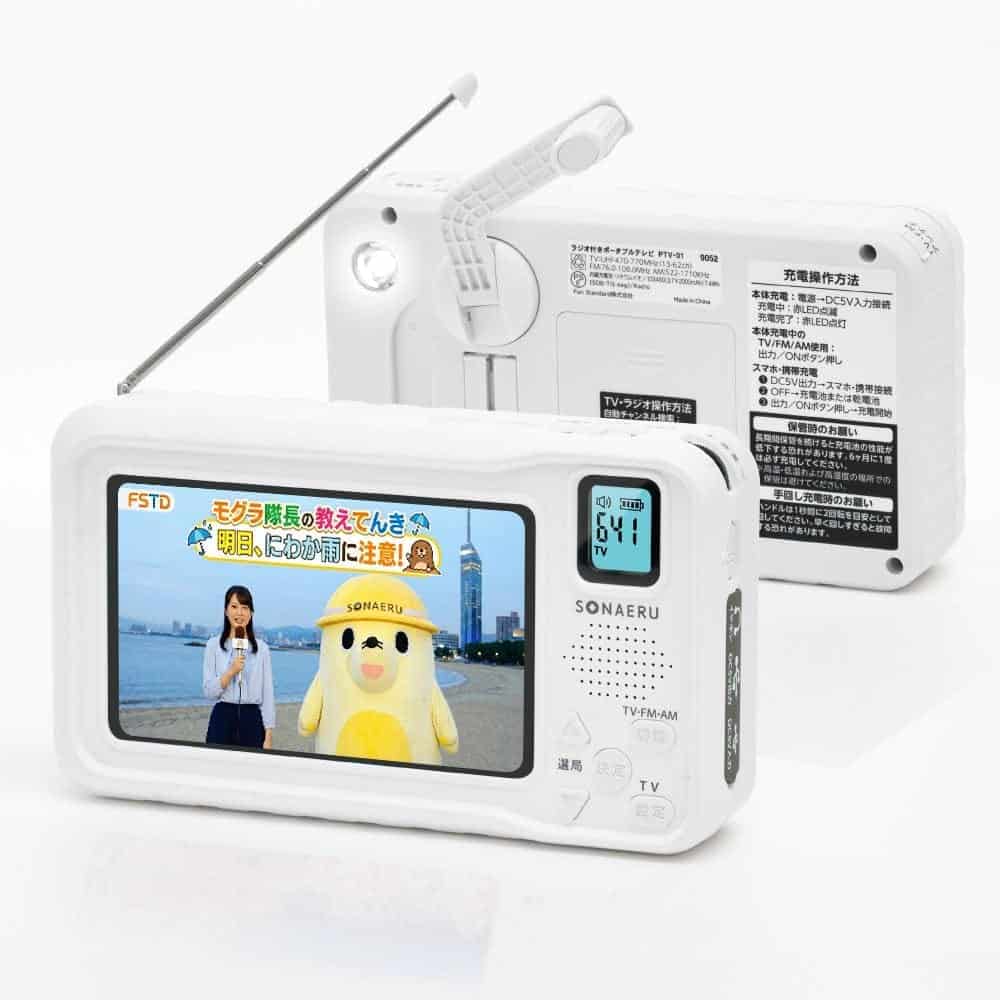「ラジオ付きポータブルテレビ PTV01」は、ワンセグとラジオで情報収集ができ、3WAY電源や手回し発電、スマホ充電にも対応。