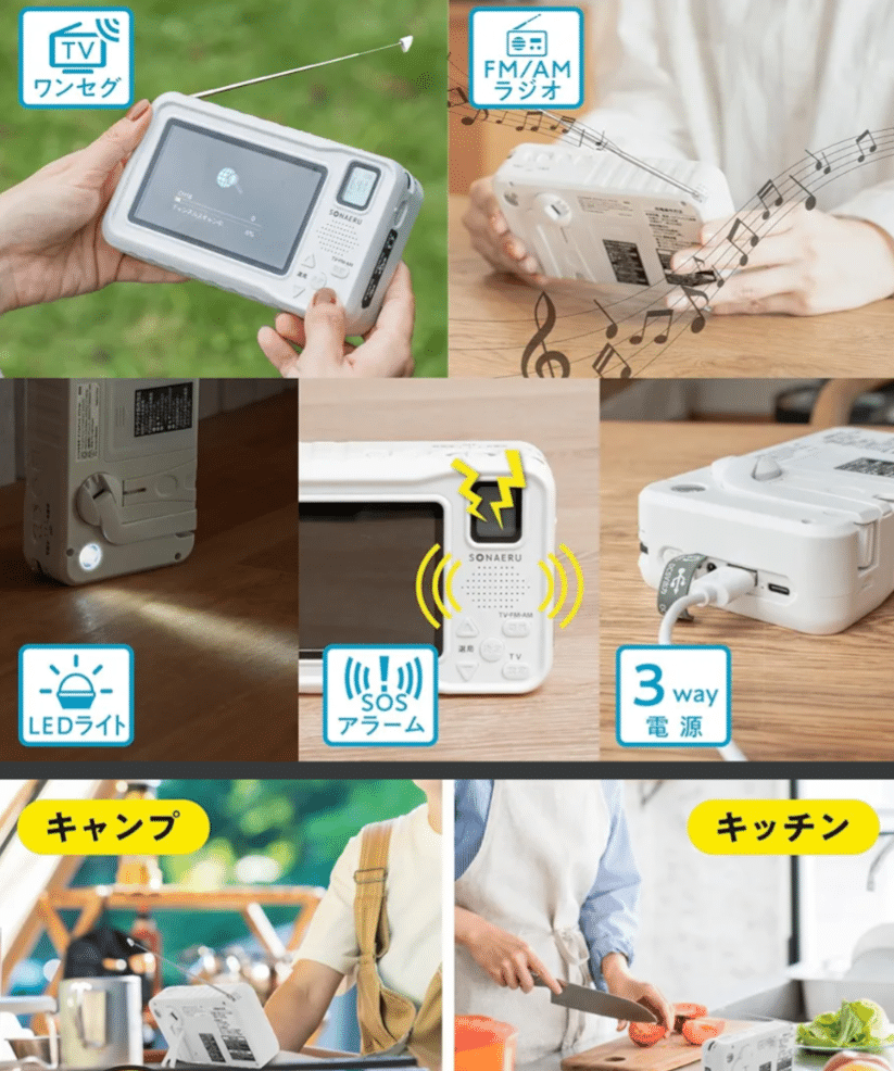 テレビやラジオに加え、電力供給の役割も果たすことで、非常時の行動の幅を広げます。
