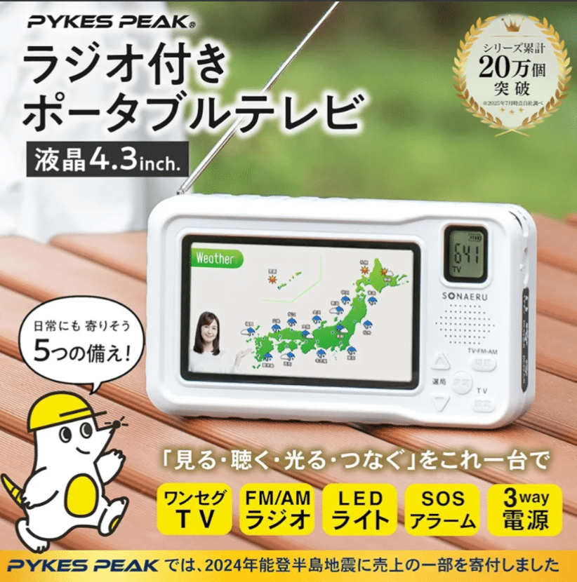 日本の企業が展開するアウトドア・防災用品ブランドのPYKES PEAKから、新商品の「ラジオ付きポータブルテレビ PTV01(SONAERUシリーズ)」が発表されました。